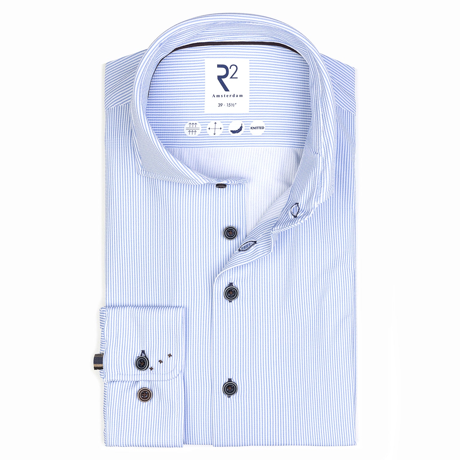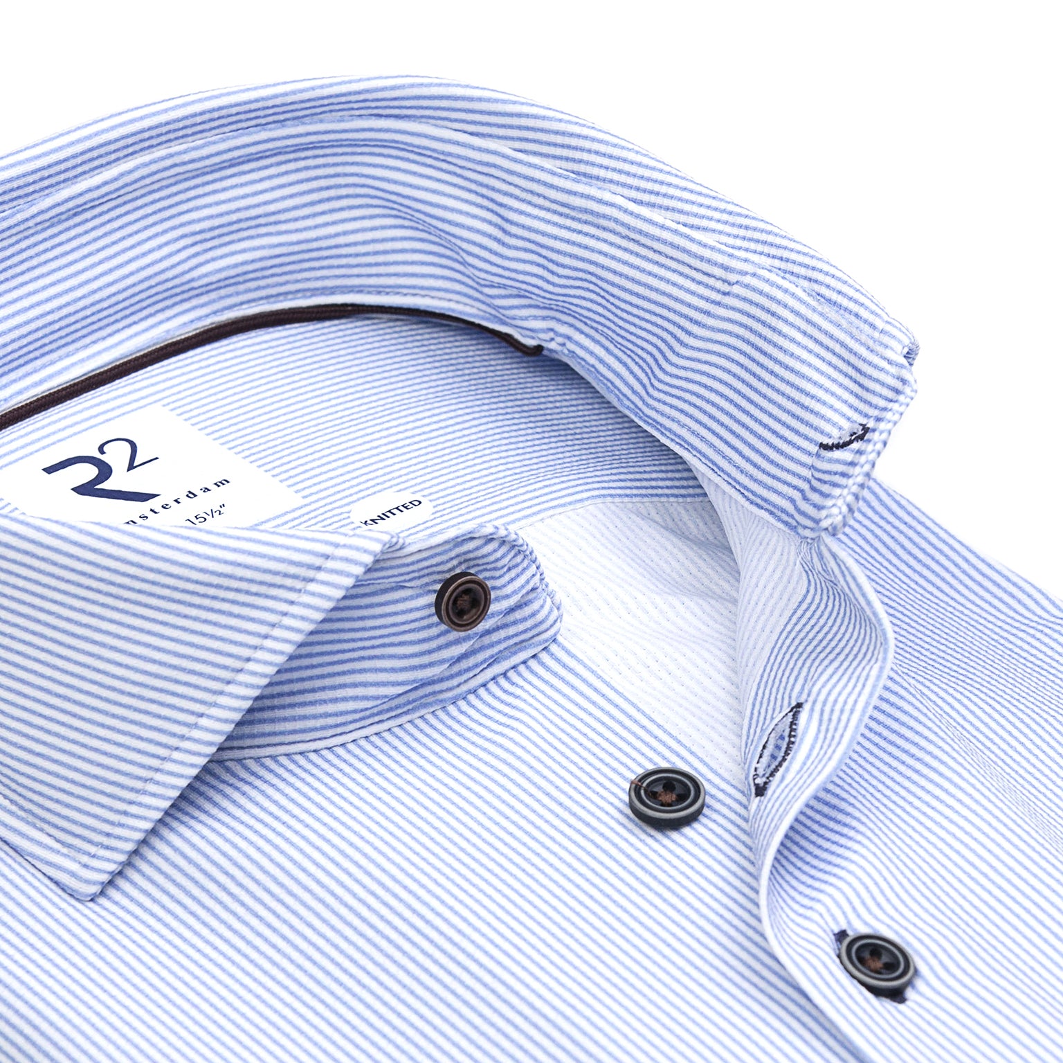 This stretch shirt features a blue dobby stripe print on a lightweight polyamide–elastane blend. Flexible and breathable, it brings subtle pattern and modern comfort together.