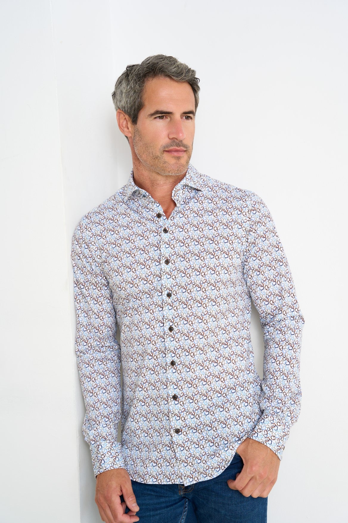 Crafted from a breathable cotton blend, this travel shirt features a playful carabiner print that adds character to its clean silhouette. Designed for flexibility and easy movement, it offers all-day comfort while maintaining a refined look — perfect for pairing with chinos or denim for a casual yet sophisticated style.