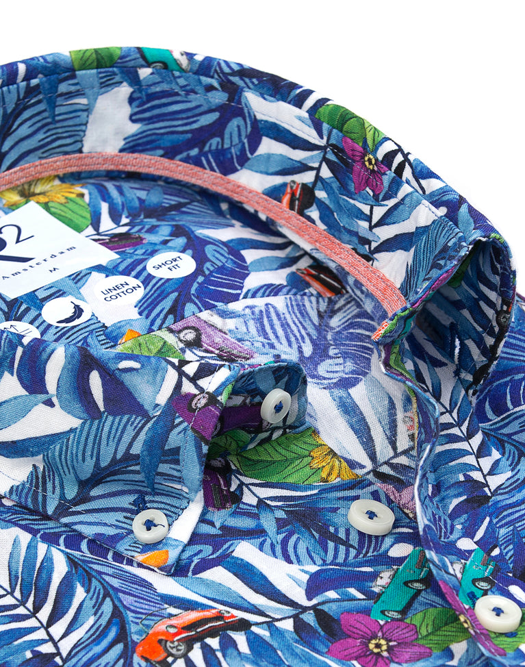 Kurzärmeliges Blumendruck Leinenmischung Hemd