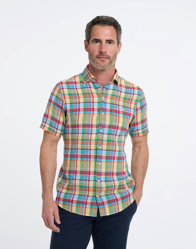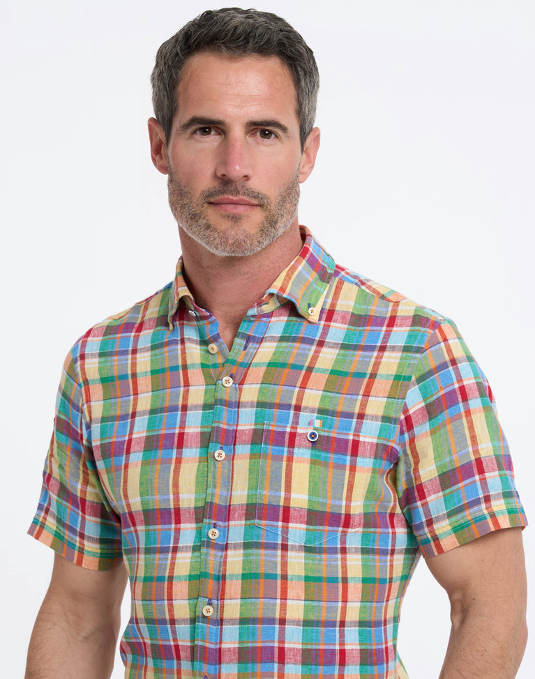 Kurzärmeliges kariertes Leinenmischung Hemd