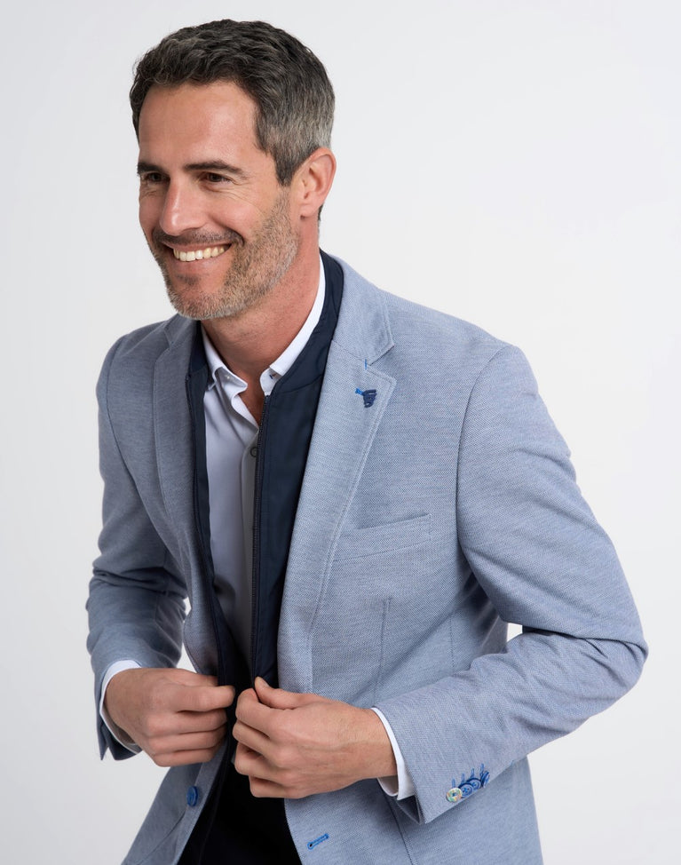 Unsere Jersey-Sakko mit herausnehmbarem Inlay kombiniert Stil und Vielseitigkeit. Aus weichem, atmungsaktivem Jersey-Stoff gefertigt, bietet diese Jacke ganztägigen Komfort. Der herausnehmbare Einsatz verleiht ihr zusätzlichen Stil und Dimension, sodass Sie Ihren Look individuell gestalten können. Egal, ob Sie sie offen oder geschlossen tragen, das schlichte Design dieser Jacke macht sie zu einer perfekten Wahl für jede Gelegenheit.