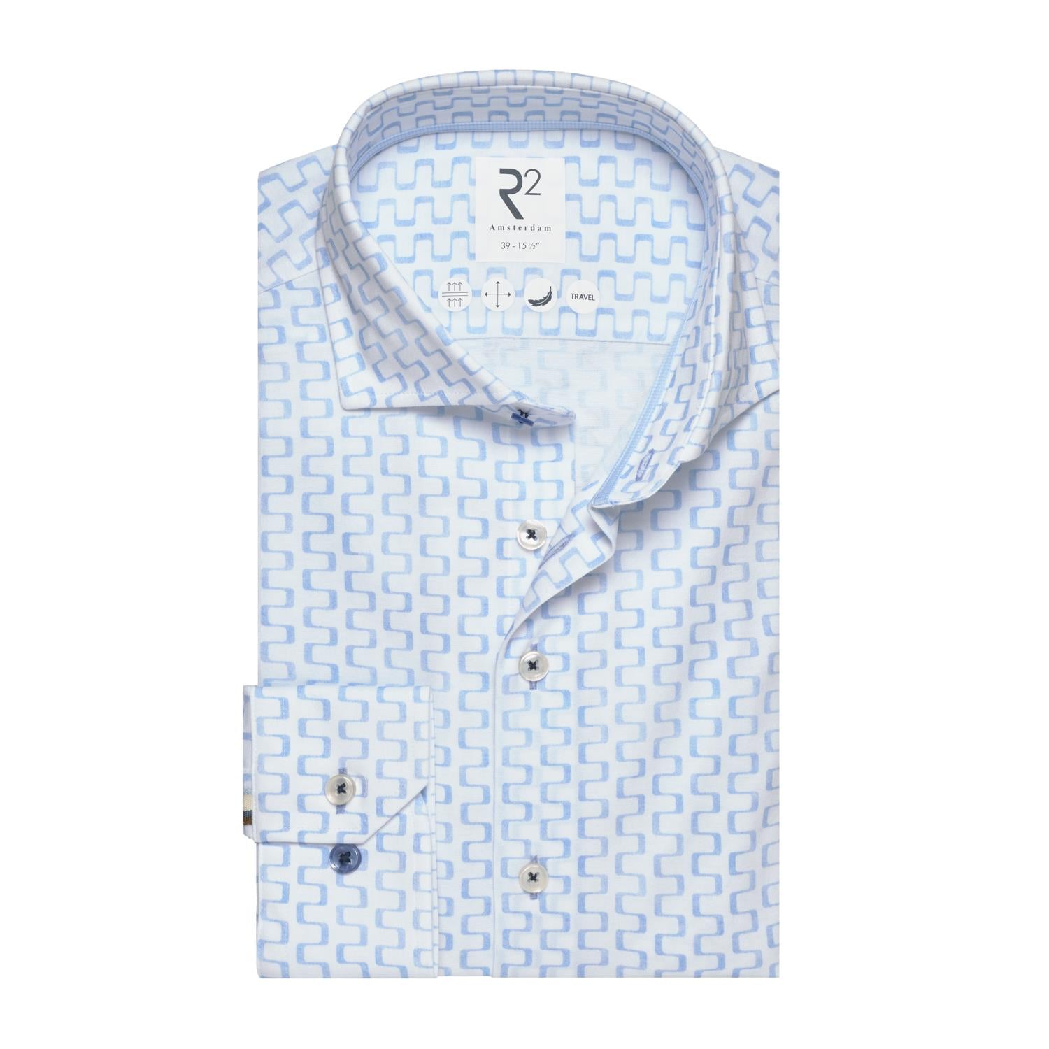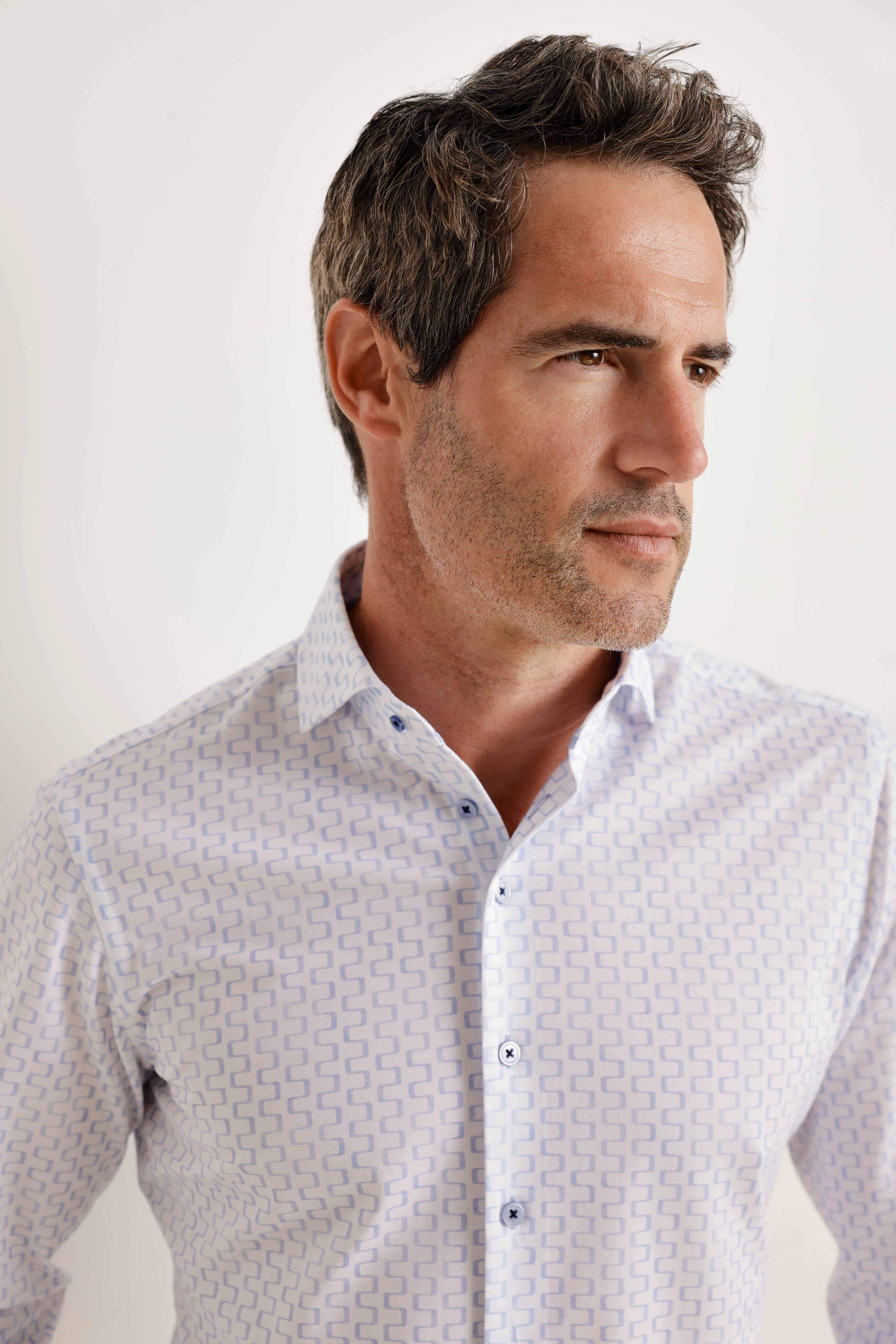 Gemaakt van een katoenmix met Sorona®, een hoogwaardige vezel die bekend staat om zijn elasticiteit en duurzaamheid. De stof biedt flexibiliteit en behoudt zijn vorm, terwijl de print karakter toevoegt aan het ontwerp. Kreukvrij en onderhoudsvriendelijk — ideaal voor dagen waarop zowel comfort als een strakke uitstraling vereist zijn.