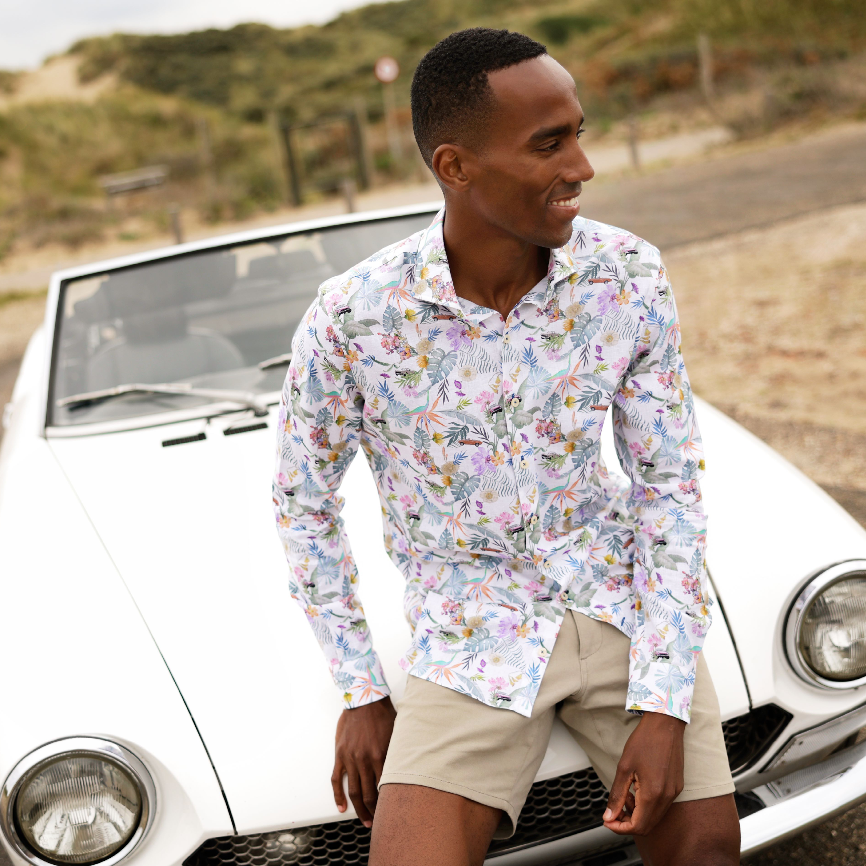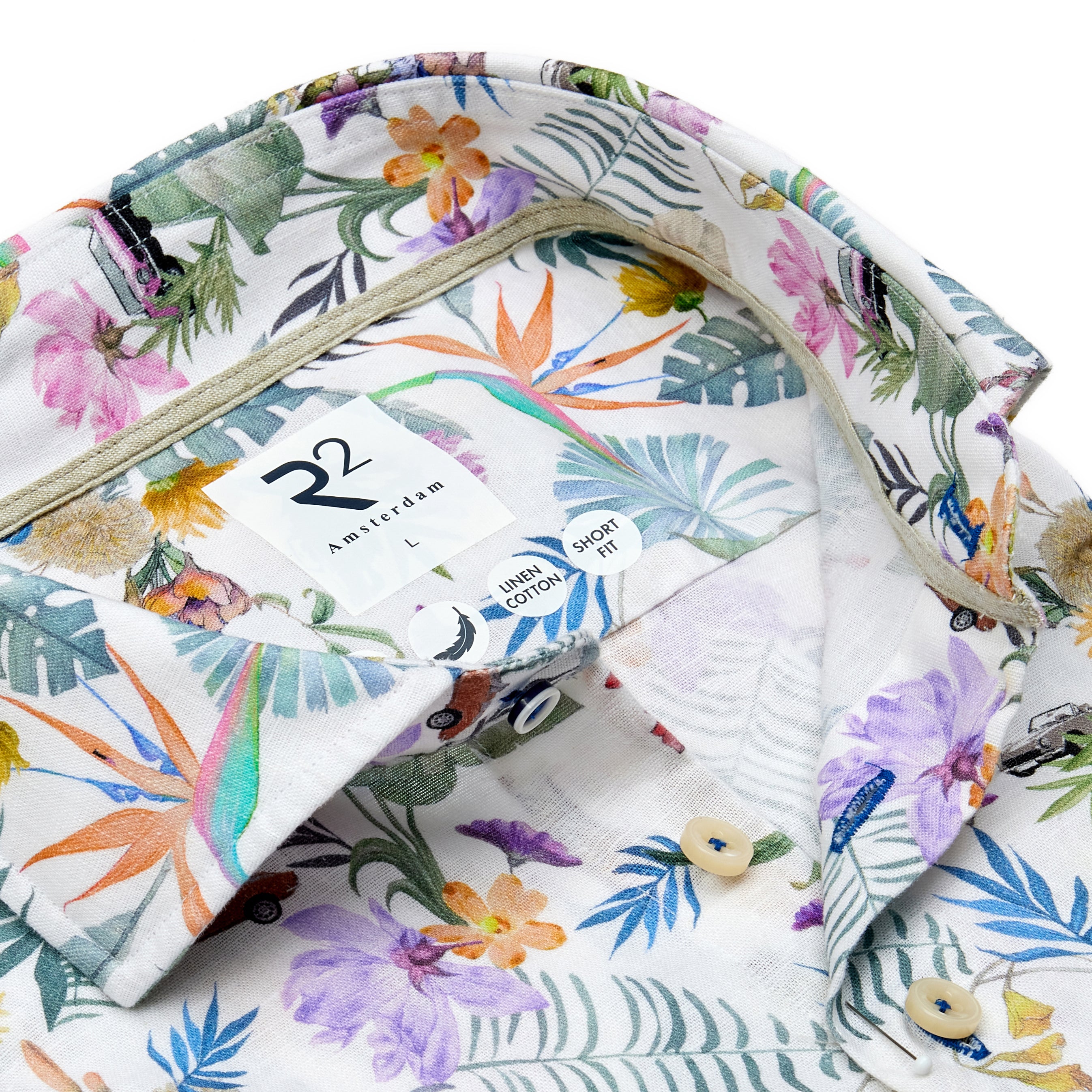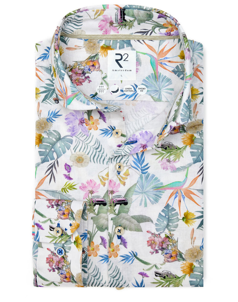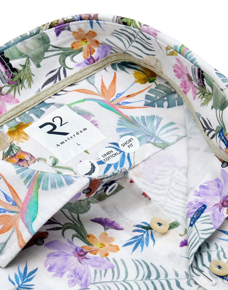 Add a fresh touch to your wardrobe with this shirt, crafted from a soft blend of 54% linen, 44% cotton, and 2% elastane for a comfortable, breathable fit with just the right amount of stretch. The widespread collar enhances its sophisticated look, while the vibrant floral print brings a bold, lively element to the design. Perfect for both casual and semi-formal occasions, this shirt combines style, comfort, and a timeless floral flair.