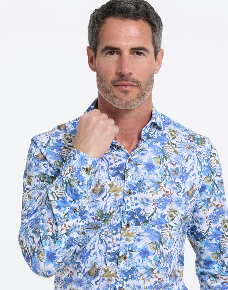 This shirt is made from technical knit fabric, offering a comfortable stretch and flexible fit. The floral print adds a fresh and vibrant touch to the design, making it a stylish addition to any wardrobe. Perfect for both casual and more relaxed occasions, this shirt combines comfort, durability, and a pop of personality.