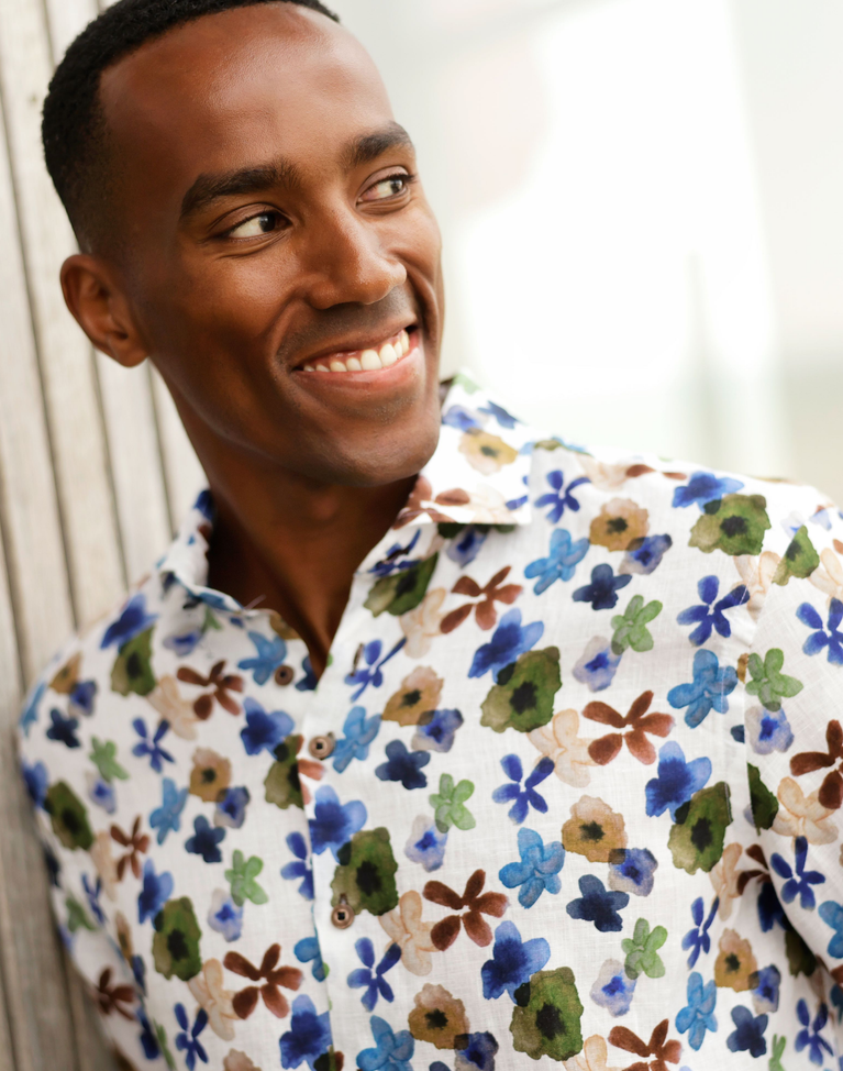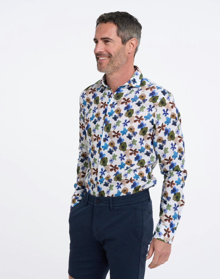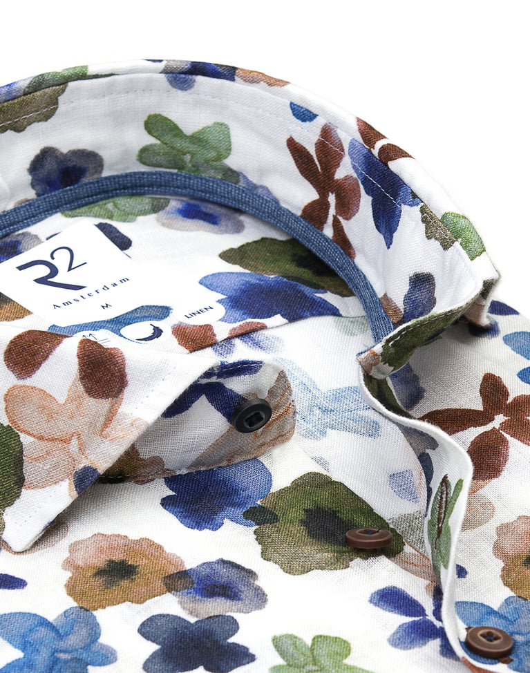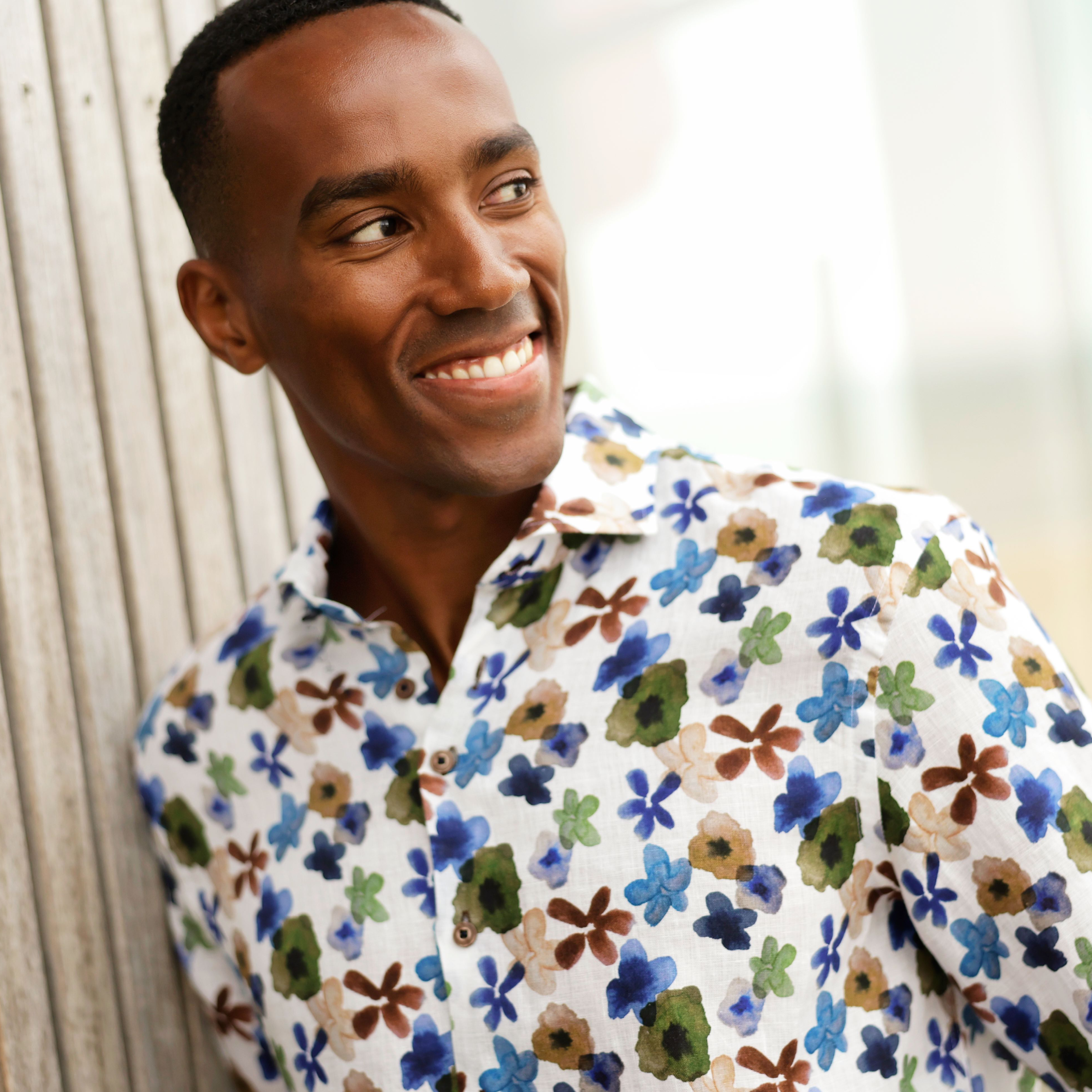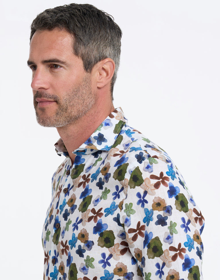 This shirt is crafted from 100% linen, offering a light and breathable feel, perfect for warmer days. The floral print adds a fresh, vibrant touch. Comfortable and stylish, this shirt brings effortless charm to your wardrobe.